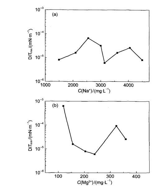 图3金属离子浓度对HDAPS/SDS混合表面活性剂溶液与原油的动态界面张力的影响