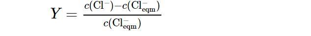 式中:c(Cl‒)(mol/L)为溶液中Cl‒的总摩尔浓度;c(Cl−eqm)(mol/L)为由于NaCl的加入而增加的Cl‒的摩尔浓度.每组实验均在Cl‒的超额含量Y=0.5的条件下进行.