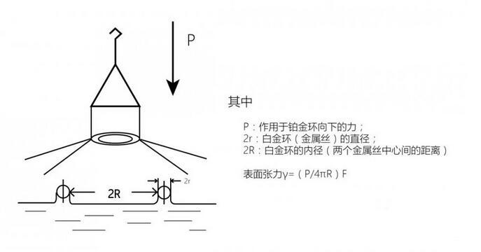 铂金环是用直径0.37mm的铂金丝做成周长为60mm的环,测试时先将铂金环浸入液面(或二种不相混合的界面)下2-3mm,然后再慢慢将铂金环向上提,环与液面会形成一个膜。膜对铂金环会有一个向下拉的力,测量整个铂金环上提过程中膜对环的所作用的最大力值,再换算成真正的表面(界面)张力值。由于铂金环法测试起来比较麻烦,测试误差也比较大,已迅速被铂金板法所取代。