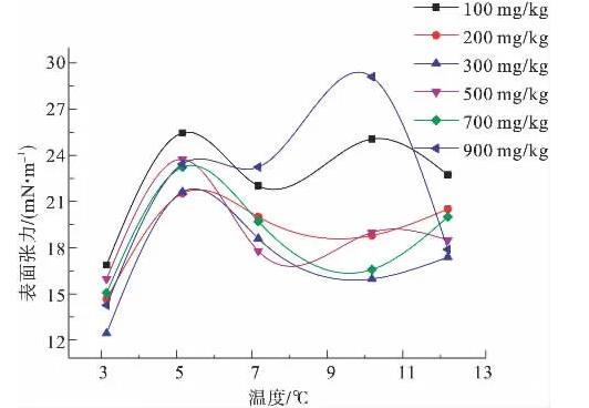 图7为100、300、500、700、900、1 200 mg/kg浓度下,本实验自行合成的离子液体[HMIPS]Ss溶液的表面张力随温度变化示意图。在低温区间内300 mg/kg溶液的表面张力曲线最低,说明该浓度的溶液表面活性最强。在所测温度范围内,整体上表面张力曲线遵循随温度升高而表面张力降低的一般规律,但相差不大,同一条曲线3℃和12℃表面张力值相差0.9~1.1 mN/m。